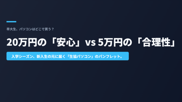 早稲田大学の生協が推奨する「早稲田パソコン」は本当に買いなのか?市販の新品PCや中古Macと比較し、20万円超の「安心料」を支払う是非を徹底検証。生協PCの過剰スペックと保険のカラクリを暴き、予算と自宅環境(メイン機との使い分け)に応じた最適なデバイス構成を提案します。
